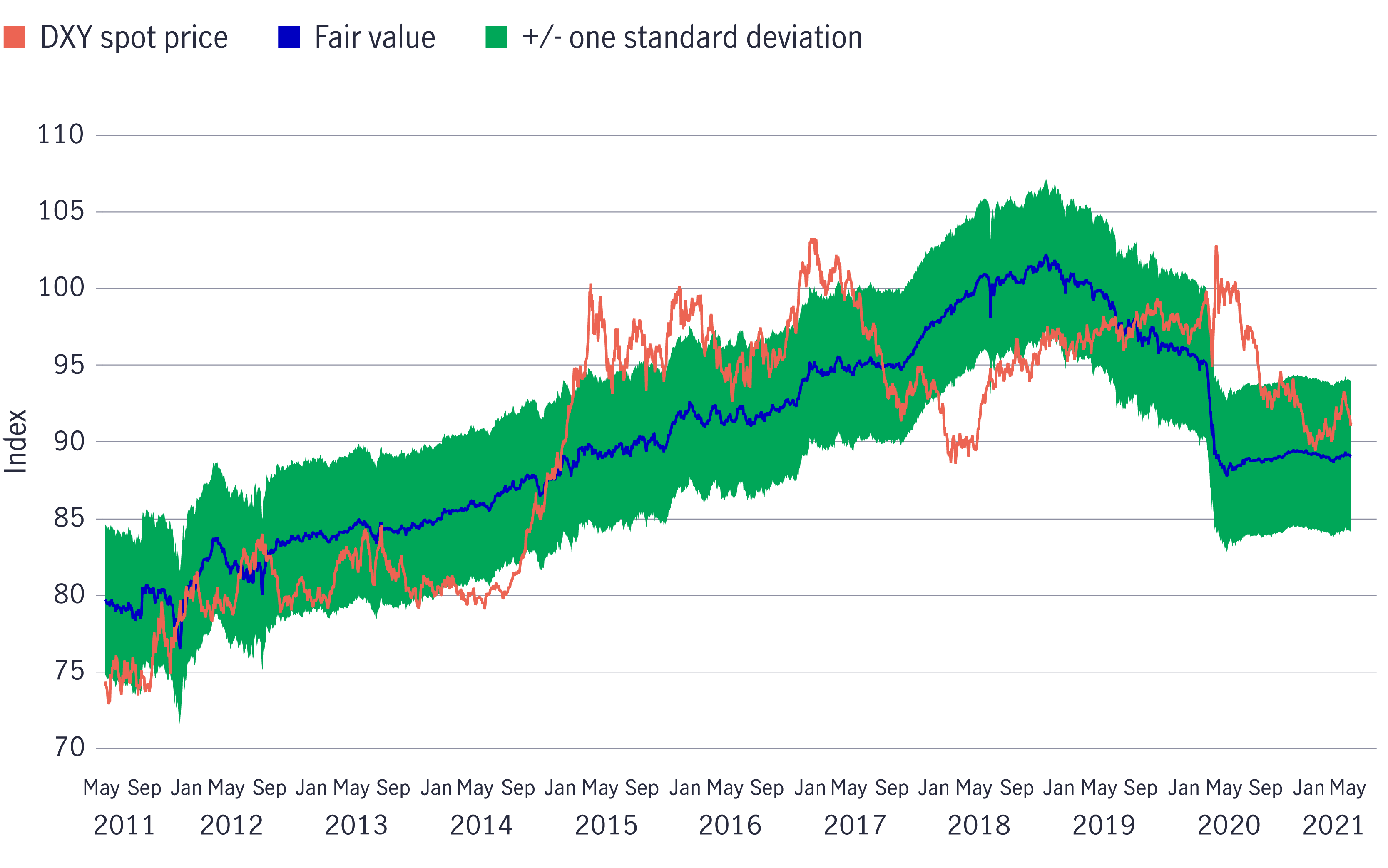 And this is where it gets interesting: Using the DXY as a proxy for the USD, we compared the spot price for the DXY with the estimated fair value for the DXY based on the 2-year spread (interest-rate differential)—by this measure, the USD is overvalued. However, a similar calculation based on the 10-year spread suggests the USD is undervalued (although it’s closer to the estimated fair value relative to the first method).³