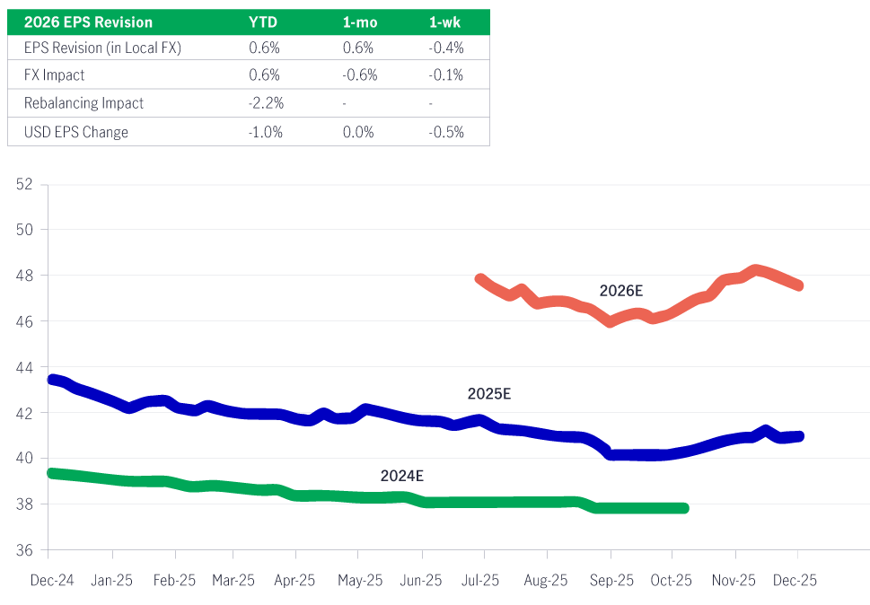 Proyeksi laba di kawasan Asia untuk 2026 sempat direvisi turun hampir sepanjang tahun. Namun, pada kuartal IV kami melihat adanya titik balik, terutama didorong oleh Korea, Taiwan, dan Hong Kong, seiring menguatnya sektor teknologi.