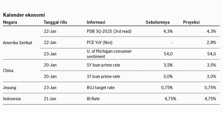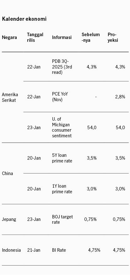 Pasar saham Amerika Serikat bergerak variatif pekan lalu di mana indeks saham kapitalisasi besar S&P 500 melemah -0.38% sementara indeks saham kapitalisasi kecil Russell 2000 menguat +2.04%. Rotasi preferensi investor masih terjadi, dengan aksi diversifikasi dari saham kapitalisasi besar yang telah mencatat kinerja unggul dalam tiga tahun. Pekan lalu pasar dikejutkan oleh kabar pemerintah Federal akan menginvestigasi The Fed dan Fed Chair Powell terkait proyek renovasi kantor pusat The Fed. Pasar mengecam aksi ini, karena dipandang berisiko mengikis independensi The Fed. Sementara itu data inflasi AS memberikan pandangan yang variatif, dengan inflasi konsumen (CPI) stabil di 2.7% YoY di November, namun inflasi produsen (PPI) naik ke 3.0% YoY. Data ini diperkirakan belum akan mengubah postur kebijakan The Fed di rapat Januari ini. Sementara itu di akhir pekan Presiden Trump mengancam akan mengenakan tarif tambahan pada 8 negara anggota NATO hingga AS dapat mencapai kesepakatan untuk akuisisi Greenland. Tarif tambahan 10% efektif 1 Februari, dan akan meningkat hingga 25% di 1 Juni apabila kesepakatan terkait Greenland belum tercapai.
