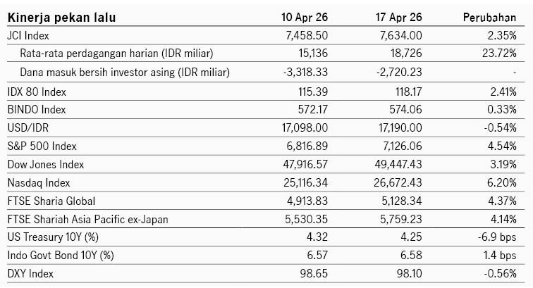 Pasar saham domestik menguat pekan lalu dengan indeks IDX80 +2.41% dan IHSG +2.35%. Sektor transportasi mencatat penguatan tertinggi, sementara sektor finansial melemah terdalam. Indeks obligasi BINDO menguat +0.33% pekan lalu dengan imbal hasil SBN 10Y relatif stabil di kisaran 6.58%. Minat investor dalam lelang SUN pekan lalu menunjukkan perbaikan, mencerminkan persepsi risiko yang lebih baik, dengan penawaran meningkat 34% mencapai IDR78.44 triliun dibanding lelang sebelumnya di 31 Maret. Pemerintah menyerap dana IDR42 triliun dari lelang tersebut. Sementara itu nilai tukar Rupiah tetap dalam tekanan, melemah -0.54% terhadap USD ke level 17190.