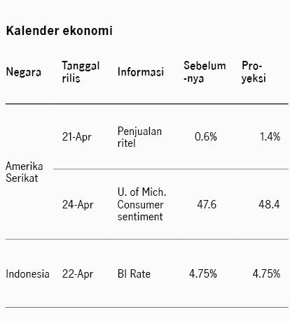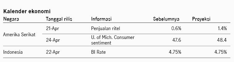 Pasar saham Amerika Serikat menguat pekan lalu didukung oleh sinyal de-eskalasi konflik Timur Tengah. Di perdagangan Jumat Iran dikabarkan telah membuka Selat Hormuz dan Presiden Trump menyatakan bahwa akan segera finalisasi kesepakatan untuk mengakhiri perang Iran. Harga minyak turun ke USD90 per barel di akhir pekan lalu dan indeks S&P 500 menguat +4.54%. Sentimen pasar juga didukung oleh data inflasi harga produsen (PPI) AS naik lebih rendah dari ekspektasi, mengindikasikan risiko tekanan inflasi yang terjaga di tengah kenaikan harga energi. PPI bulan Maret naik ke 4.0% YoY dari bulan sebelumnya 3.4%, namun lebih rendah dari ekspektasi konsensus di 4.6%. PPI inti (di luar energi dan makanan) stabil di 3.8% YoY. Data ini memperkuat harapan The Fed masih dapat memangkas suku bunga tahun ini. Kondisi ini mendukung imbal hasil UST 10Y turun dari 4.32% ke 4.25%. Namun kondisi kembali memanas di akhir pekan, setelah terjadinya insiden dalam blokade Selat Hormuz yang menyebabkan militer AS menyita kapal Iran. Teheran merespons dengan kembali menutup jalur Selat Hormuz, menyebabkan harga minyak kembali melonjak ke level USD95 per barel di Senin pagi.