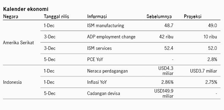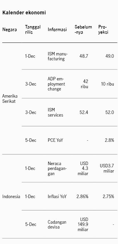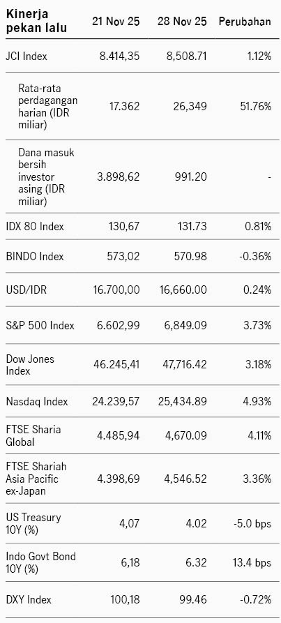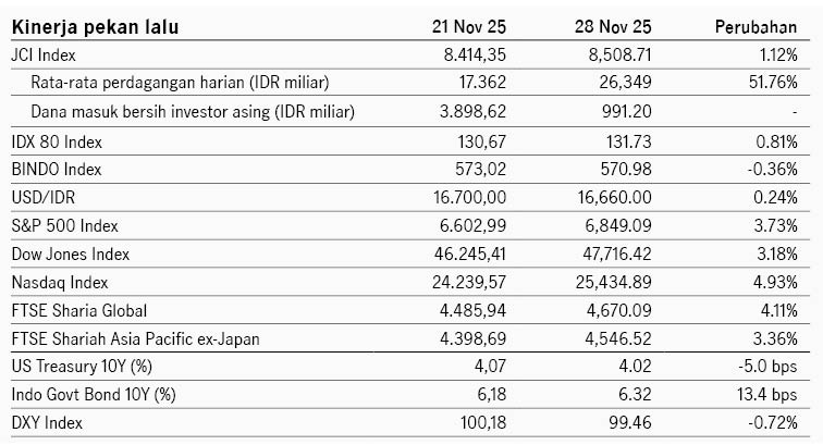 Sentimen di pasar saham Amerika Serikat berbalik menjadi lebih positif dibanding pekan sebelumnya di mana sempat terdapat kekhawatiran terkait valuasi tinggi di sektor teknologi. Sentimen pasar berbalik positif didukung menguatnya optimisme Fed Funds Rate dapat menurun di rapat FOMC mendatang seiring dengan komentar dovish dari beberapa pejabat The Fed dan data ekonomi AS yang melemah. Pejabat The Fed Mary Daly, Christoper Waller, dan John Williams mendukung penurunan suku bunga di Desember karena sektor tenaga kerja yang melemah. Sementara itu data konsumsi AS relatif lemah dengan penjualan ritel +0.2% di September, turun dari sebelumnya +0.6%, dan keyakinan konsumen turun ke level 88.7 di November dari sebelumnya 95.5, level terendah dalam tujuh bulan. Merespons perkembangan ini, probabilitas penurunan Fed Funds Rate Desember menguat ke 83% dari akhir pekan sebelumnya di 63%. Indeks S&P 500 ditutup +3.7% pekan lalu dan imbal hasil UST 10Y turun dari 4.06% ke 4.01%. Pekan ini pasar akan memperhatikan data tenaga kerja dan inflasi PCE AS yang menjadi rilis penting terakhir sebelum rapat FOMC di 11 Desember.