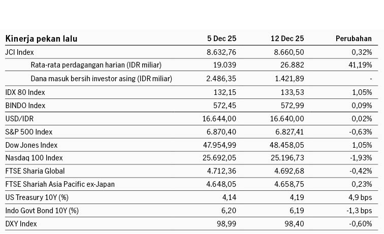 Dari dalam negeri, pemerintah merevisi peraturan retensi dana hasil ekspor SDA non-migas, dengan kewajiban retensi 100% selama minimal 12 bulan dan konversi valas ke Rupiah paling banyak 50%, dengan seluruh penempatan di Himbara. Rupiah berhasil menahan pelemahan, cukup stabil di kisaran 16650 per dolar AS. Dari data ekonomi, Indeks Keyakinan Konsumen melonjak ke level 124 - dari bulan sebelumnya 121 - level tertinggi sejak Februari 2025 di 126. Sepanjang pekan kemarin IHSG (+0.32%) kalah unggul dibandingkan dengan IDX80 (+1.05%) namun lebih baik dibandingkan LQ45 (+0.13%). Sementara di pasar obligasi, setelah mencerna kebijakan The Fed, pasar cenderung bersikap wait and see menunggu RDG terakhir pekan ini.