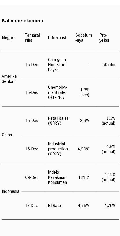 Sepanjang pekan lalu pasar AS bergerak fluktuatif dipicu berita arah kebijakan bank sentral, perbedaan pendapat antar pejabat bank sentral mengenai arah kebijakan moneter 2026, dan juga kekhawatiran sektor teknologi, terkait belanja AI. Dari sisi kebijakan, rilis data pekan lalu cukup sesuai dengan ekspektasi pasar, di mana inflasi meningkat (2.8% YoY per September), belanja konsumsi masyarakat turun (+0.3% dari sebelumnya +0.5%), yang diikuti oleh penurunan FFR ke 3.5% - 3.75%. Sementara dari pasar saham, fokus pada sektor teknologi kembali mengemuka setelah serangkaian rilis kinerja korporasi mengafirmasi besarnya belanja modal untuk AI. Para pengamat pasar melihat hampir tidak pernah terjadi sebelumnya belanja modal yang sedemikian besar, terakumulasi dalam waktu yang sangat singkat, untuk sebuah sub-sektor yang sangat spesifik yaitu AI.