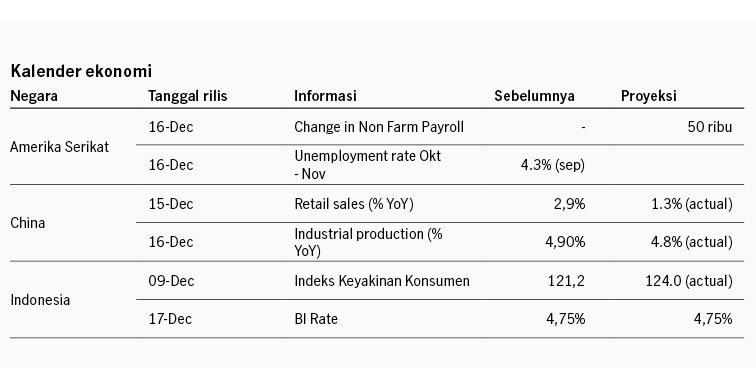 MSCI Asia Pacific menguat +0.53% pekan lalu. Euforia penurunan FFR tidak berlangsung lama karena memang sudah di ekspektasi, namun perpecahan pendapat antara pejabat The Fed justru membuat pasar cenderung berhati-hati mengambil keputusan investasi. Selain itu, saham-saham teknologi menjadi pemberat utama, baik dari global seperti Oracle, maupun dari Asia sendiri seperti saham SK Hynix yang sempat merosot tajam setelah regulator memberi peringatan investasi terhadap saham tersebut, terkait aktivitas margin trading berlebihan yang dipicu spekulasi pencatatan saham di bursa AS. Mengakhiri pekan, rapat ekonomi pemerintah China dengan komitmen untuk melanjutkan kebijakan perbaikan ekonomi di 2026 mengangkat sentimen.