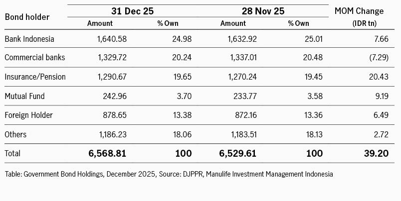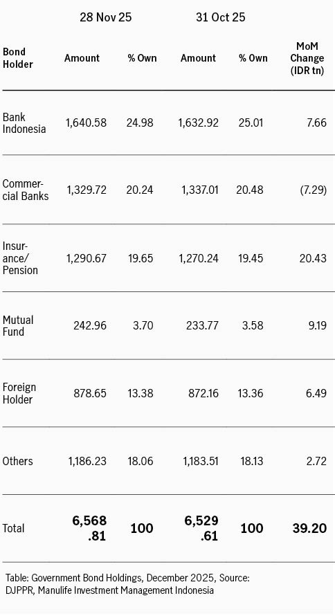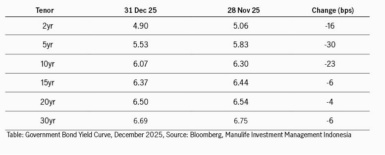 Bank Indonesia mempertahankan suku bunga acuan di 4.75%. Keputusan ini sejalan dengan konsensus pasar yang memperkirakan BI akan berupaya menopang nilai tukar di tengah inflasi yang terjaga. BI juga mengurangi penerbitan SRBI, dengan imbal hasil tertimbang rata-rata untuk SRBI 12 bulan terus turun dari 4.95% ke 4.92%. Secara umum, sentimen pasar tetap suportif walaupun ada potensi penerbitan obligasi yang lebih besar tahun 2026. Ekspektasi masih adanya ruang pelonggaran moneter di 2026 menjadi salah satu penopang tetap solidnya kinerja pasar di bulan terakhir 2025.