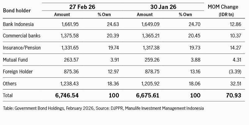 Selama Februari investor asing mencatatkan penjualan bersih IDR3.39 triliun, sehingga kepemilikan asing turun menjadi 12.97% dari 13.16% bulan sebelumnya. Sepanjang bulan, pembeli bersih terbesar adalah investor individu dan kategori ‘lainnya’, menambah kepemilikan IDR32.51 triliun membuat persentase kepemilikan naik ke 18.36%.