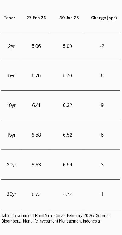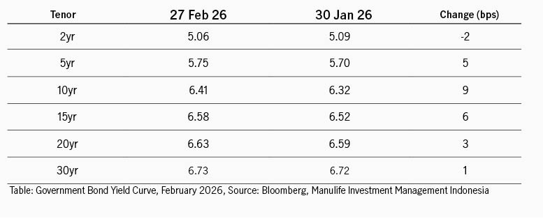 Di dalam negeri, revisi outlook kredit Indonesia oleh Moody’s juga ikut berdampak pada arah pergerakan imbal hasil. Lembaga pemeringkat itu resmi mengubah outlook peringkat utang Indonesia dari Stabil menjadi Negatif, sambil mempertahankan rating utang negara di Baa2. Penurunan outlook ini dipicu kekhawatiran atas pelemahan tata kelola dan ketidakpastian kebijakan terkait pembentukan Badan Pengelola Investasi Danantara (BPI), yang dinilai berpotensi menimbulkan contingent liabilities (utang bersyarat atau utang yang belum tentu terjadi dan sangat tergantung kejadian di masa depan) seiring pengelolaan aset yang sangat besar. Pasar juga menanti pengumuman outlook dari Fitch di awal Maret, dan S&P di bulan Juli. Terkait kebijakan moneter, Bank Indonesia menahan suku bunga acuan di 4.75%, saat ini tetap fokus pada upaya stabilisasi rupiah dan menjaga pertumbuhan ekonomi. BI juga mengubah pendekatan dengan meningkatkan penerbitan SRBI di pasar untuk menarik minat investor, imbal hasil rata-rata tertimbang SRBI tenor 12 bulan naik dari 4.96% menjadi 5.17%.