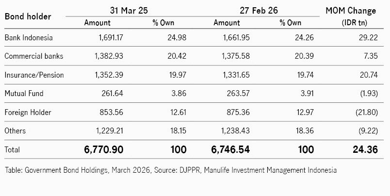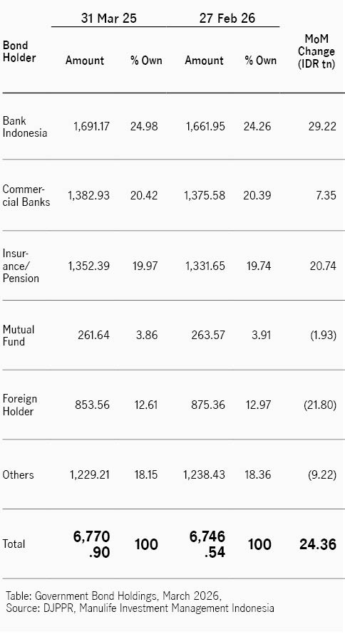 Investor asing mencatatkan posisi jual bersih pada bulan Maret, dengan nilai sekitar IDR21,80 triliun sehingga porsi kepemilikan asing turun menjadi 12,61%, dari 12,97% pada bulan sebelumnya. Sebaliknya, pembeli terbesar selama periode tersebut adalah Bank Indonesia, yang menambah kepemilikan obligasi IDR29,22 triliun sehingga total kepemilikannya meningkat menjadi 24,98%.