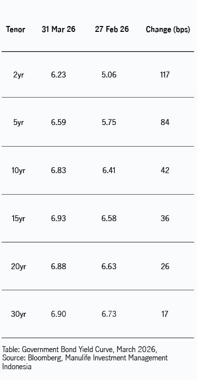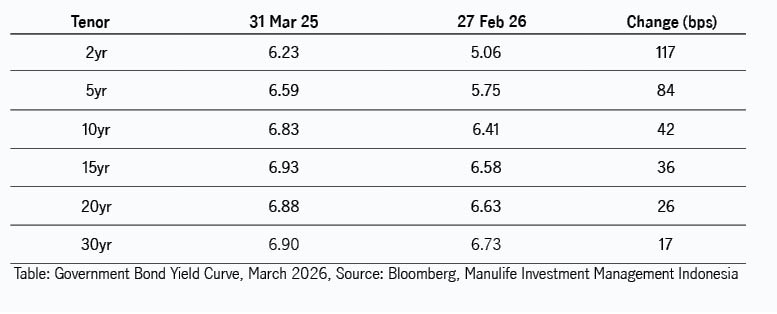 Secara keseluruhan, kurva imbal hasil menunjukkan pola bearish flattening, di mana kenaikan imbal hasil lebih besar terjadi pada bagian tenor pendek. Imbal hasil obligasi tenor 2 tahun meningkat tajam sebesar 117 basis poin, menjadikannya segmen yang berkinerja paling lemah selama periode tersebut.