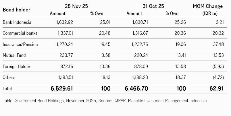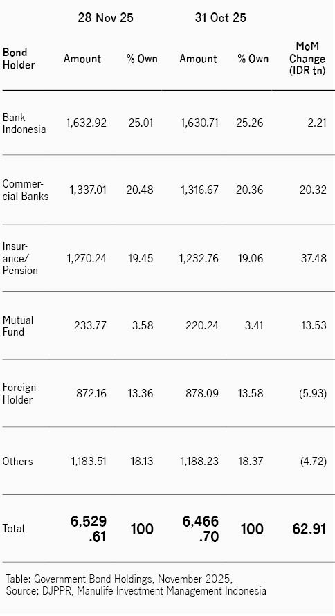 Di bulan November, investor asing tetap mencatatkan posisi jual bersih sebesar IDR5,93 triliun, sehingga kepemilikan asing turun menjadi 13,36% dari total obligasi pemerintah yang dapat diperdagangkan, dibandingkan bulan sebelumnya 13,58%. Investor lainnya juga mencatat penjualan bersih sebesar IDR4,72 triliun. Di sisi lain, asuransi dan dana pensiun menjadi pembeli bersih terbesar.