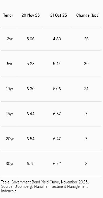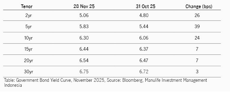 Kurva imbal hasil menunjukkan pola bear flattening, dengan tenor menengah panjang lebih unggul, dengan imbal hasil tenor 15 tahun hanya naik 7 bps, 20 tahun naik 7 bps, dan 30 tahun naik 3 bps saja.