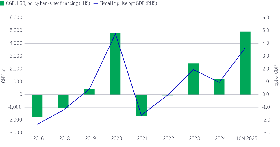 Selama tiga kuartal pertama tahun 2025, pembiayaan pemerintah termasuk obligasi pemerintah pusat (CGB), obligasi pemerintah daerah (LGB), dan penerbitan oleh bank kebijakan (Policy Bank issuance) meningkat sebesar RMB 4,9 triliun. Peningkatan ini membantu mendorong stimulus fiskal hingga hampir 3,7 poin persentase terhadap PDB (Grafik 1).