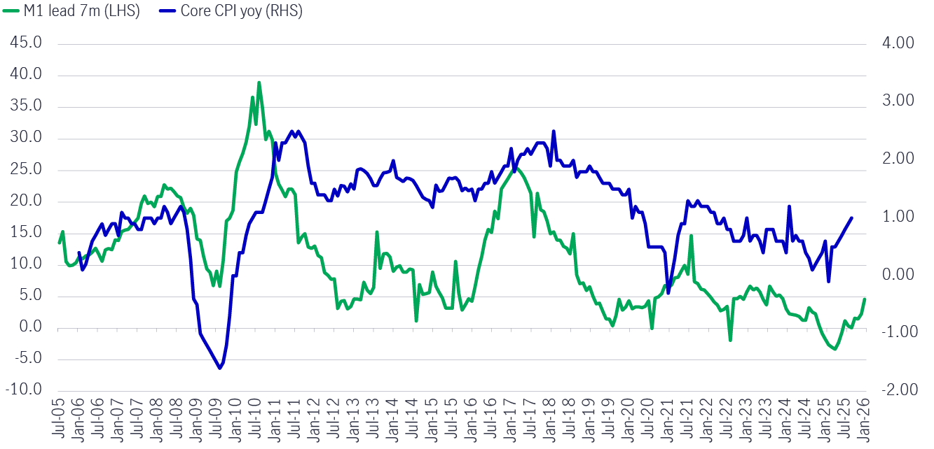 Grafik 3: Jumlah uang beredar di China (M1) dan inflasi inti (Core CPI)3