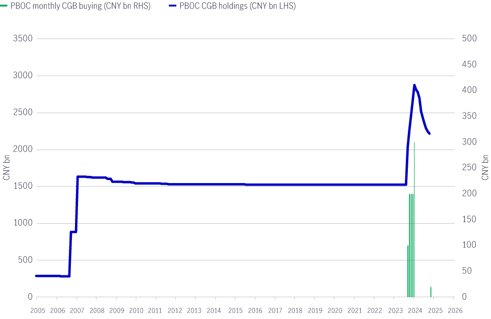 Kami memperkirakan program pembelian CGB oleh PBOC akan terintegrasi erat dengan pasokan fiskal. Nilai pembelian bulanan diperkirakan berada di kisaran RMB 150–200 miliar, dengan pembelian diperluas ke obligasi berjangka waktu 5–10 tahun (yaitu bagian tengah kurva imbal hasil).