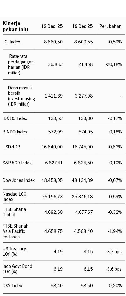 Pasar saham Amerika Serikat bergerak fluktuatif pekan lalu dibayangi oleh kekhawatiran terhadap valuasi sektor teknologi yang terlalu tinggi serta data ekonomi yang variatif. Data tenaga kerja AS lemah dengan angka pengangguran November tercatat 4.6% (tertinggi sejak September 2021 di era pandemi) naik dari bulan September 4.4%. Dari sisi pertumbuhan tenaga kerja, data non farm payroll bulan November tercatat hanya naik +64 ribu, lebih rendah dari bulan September +108 ribu. Dari sisi daya beli dan konsumsi, data penjualan ritel bulan Oktober secara keseluruhan tercatat flat hanya tumbuh 0.03%. Sementara itu pasar merespons positif data inflasi AS yang lebih rendah dari ekspektasi. Inflasi umum 2.7% YoY (ekspektasi 3.1% YoY), sementara inflasi inti di 2.6% YoY, yang merupakan level terendah sejak Maret 2021. Inflasi yang lebih jinak dari perkiraan - di tengah rilis beruntun data ketenagakerjaan yang memburuk - diharapkan membuat The Fed "lebih mudah" mengambil keputusan untuk melanjutkan penurunan suku bunga di 2026. Indeks S&P 500 ditutup +0.10% sementara indeks Dow Jones -0.67%.