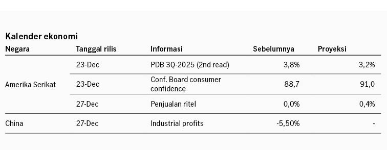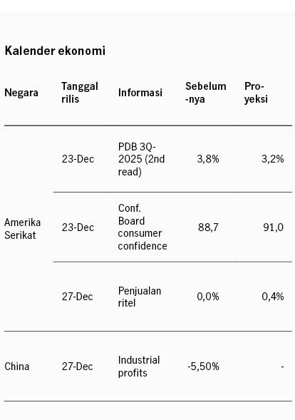 Di domestik, BI kembali mempertahankan suku bunga acuan di level 4.75%, dengan fokus saat ini stabilisasi Rupiah. Ke depannya BI menyatakan tetap terus mengkaji dan tidak mengesampingkan potensi penurunan lanjutan BI rate. BI juga menekankan transmisi penurunan suku bunga acuan yang masih belum terefleksi dengan baik ke penurunan suku bunga kredit dan pertumbuhan kredit (YTD November +7.7%, target 2025 di 8% - 11%). Sementara itu Kementerian Keuangan melaporkan defisit anggaran sampai November tercatat 2.35% dari PDB, dan estimasi untuk keseluruhan 2025 akan berada di level 2.78% dari PDB. Indeks saham IDX80 ditutup melemah -0.17% pekan lalu, sementara indeks obligasi BINDO menguat +0.18%. Imbal hasil SBN 10Y turun dari 6.18% ke 6.14%, sementara nilai tukar Rupiah terhadap USD melemah -0.63% ke 16745.