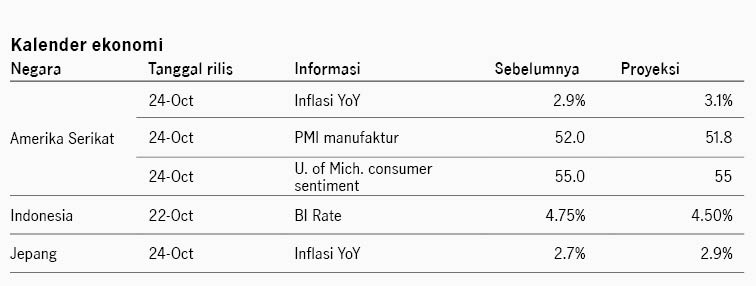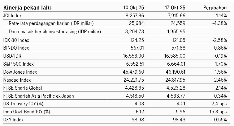 Pasar saham Amerika Serikat bergerak fluktuatif pekan lalu namun berhasil ditutup menguat. Indeks S&P 500 ditutup +1.70% pekan lalu dan imbal hasil UST 10Y stabil di kisaran 4.01%. Kinerja positif pasar didukung oleh laporan earnings yang positif dari perbankan besar AS seperti JPMorgan Chase, Citigroup, dan Wells Fargo yang melaporkan earnings Q3 lebih baik dari ekspektasi. Selain itu optimisme The Fed akan melanjutkan pemangkasan suku bunga semakin menguat setelah Fed Chair Powell mengindikasikan pandangan yang lebih berhati-hati terhadap risiko pelemahan sektor tenaga kerja. Data laporan aktivitas ekonomi dalam Fed Beige Book mengindikasikan konsumsi dan sektor tenaga kerja yang melemah. Sementara itu sikap Presiden Trump terhadap China melunak, mengatakan ancaman tarif 100% tidak realistis, dan mengindikasikan rencana pertemuan dengan Presiden Xi akan tetap berlangsung.