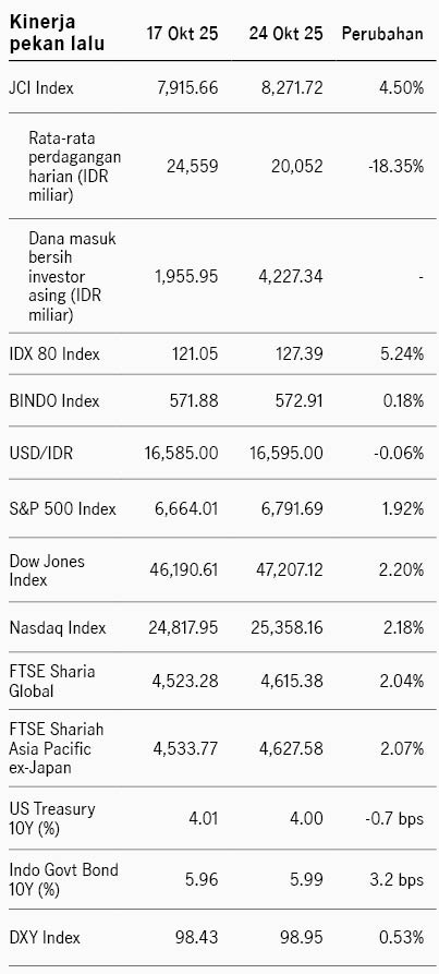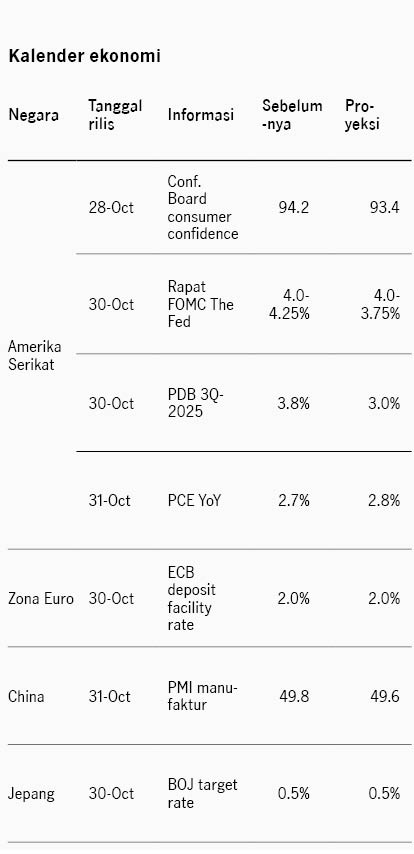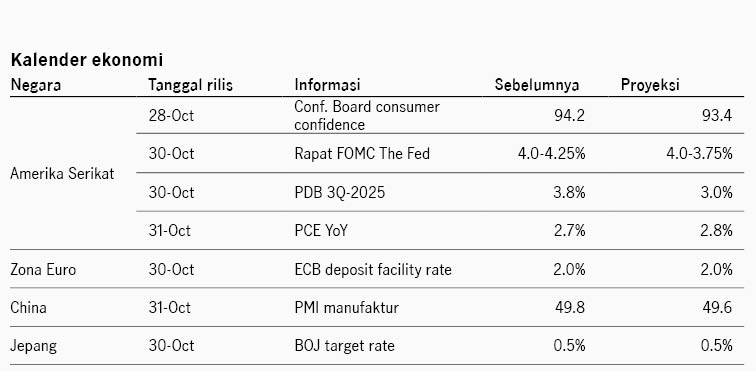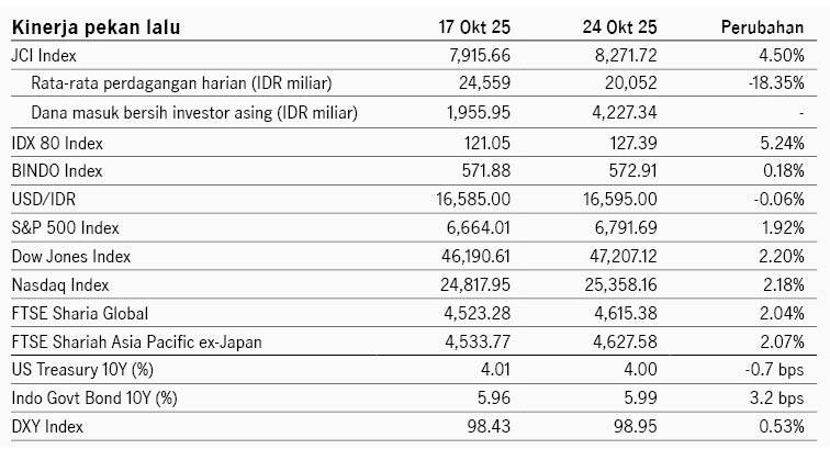 Pasar saham Amerika Serikat bergerak fluktuatif pekan lalu di tengah volatilitas kondisi geopolitik AS - China dan Rusia. pemerintah AS berencana untuk membatasi ekspor produk software ke China, merespons kebijakan China sebelumnya untuk membatasi ekspor material rare earth. Namun tensi mereda setelah AS dan China mengindikasikan telah mencapai kesepakatan awal untuk beberapa poin pada perundingan akhir pekan lalu di Kuala Lumpur, yang membuka ruang untuk kesepakatan lebih lanjut pada pertemuan Presiden Trump dengan Presiden Xi pekan ini. Sementara itu AS menambah sanksi terhadap dua perusahaan migas terbesar Rusia karena proses gencatan senjata Ukraina - Rusia yang lambat. Harga minyak Brent melonjak +7.6% pekan lalu ke USD65.9 per barel. Sentimen pasar beranjak positif merespons data inflasi yang lebih rendah dari ekspektasi sehingga mendukung pandangan The Fed dapat memangkas suku bunga di rapat pekan ini. Inflasi AS naik ke 3.0% YoY di September dari sebelumnya 2.9%, namun lebih rendah dari ekspektasi 3.1%. Indeks S&P 500 ditutup +1.92% dan imbal hasil UST 10Y relatif stabil di 4.0%. Pekan ini pasar menantikan rapat FOMC, dengan konsensus memperkirakan suku bunga 25bps.