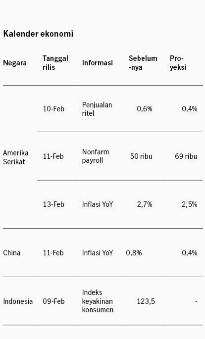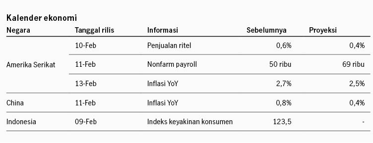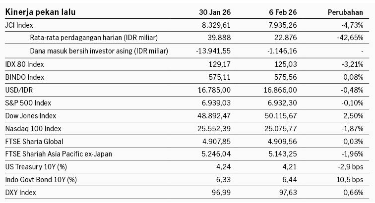 Pasar saham Amerika Serikat bergerak fluktuatif pekan lalu di tengah pelemahan sektor teknologi dan data tenaga kerja yang melemah. Sektor teknologi melemah terutama terjadi di saham software data service, setelah perusahaan AI Anthropic merilis AI automation tools yang dikhawatirkan dapat mengikis bisnis software data service. Pasar juga mengkhawatirkan potensi return of investment emiten teknologi besar AS yang mengindikasikan masih akan mengeluarkan belanja modal besar untuk AI. Alphabet mengindikasikan belanja modal 2026 akan mencapai USD185 miliar, lebih besar dari belanja modal 3 tahun sebelumnya secara kumulatif. Dari sisi data ekonomi, data tenaga kerja AS menunjukkan pelemahan, di mana ketersediaan pekerjaan (JOLTS) turun ke 6.5 juta di Desember dari sebelumnya 6.9 juta. Indeks S&P 500 ditutup -0.10% pekan lalu dan imbal hasil UST turun dari 4.23% ke 4.20%.